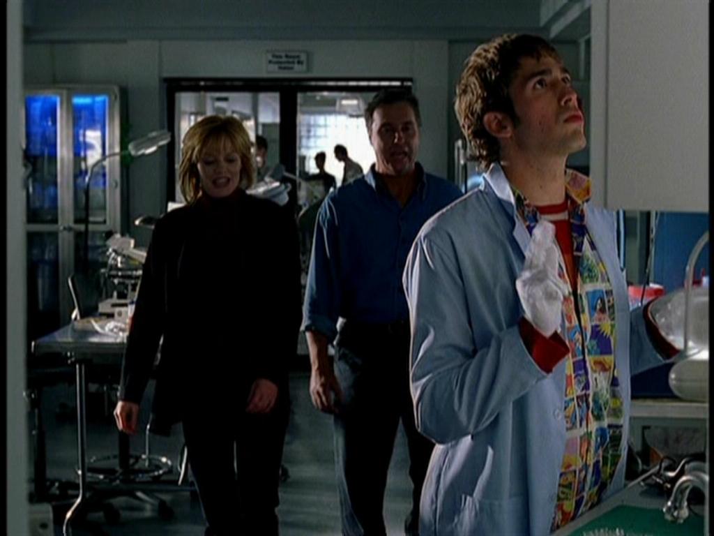 Greg walks into the break room where Grissom is eating. Greg gets himself an ice-cream out of the refrigerator and sits down. They talk about the current case.